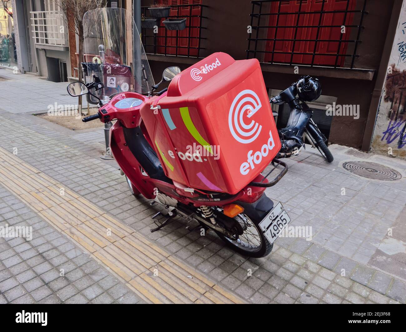 Thessaloniki Greece February 20 2021 Efood Online Delivery Courier Motorbike On A City Road Day View